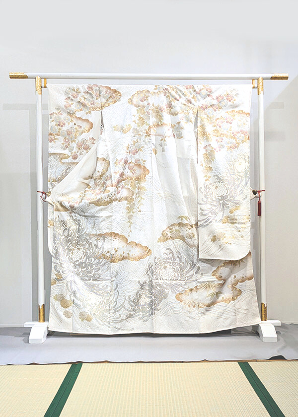 光を受けるたびにさりげなくきらめき、清楚さの中に華やかさを感じさせます。柔らかな金銀の色調で描かれた文様が繊細に広がり、過度な装飾を抑えたシンプルな美しさが際立つ一着になっています。