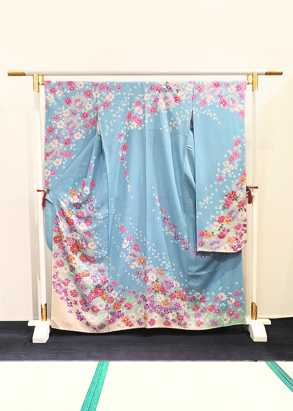 やわらかな水色の地色に、可憐な花々が咲き広がる華やかな振袖です。